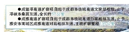 从具体建设规划来看,成温邛高速扩容项目起于成都市绕城高速文家场枢纽,止于邛崃市桑园互通(接成名高速公路邛崃至名山段),路线全长约57公里,全线采用原路拓宽方式建设双向8车道。成雅高速扩容项目起于成都市绕城高速白家枢纽互通,串联成都、眉山、雅安3市8县(市、区),止于雅安市雨城区成雅高速对岩枢纽互通(接G5雅安至西昌、G4218雅安至康定高速公路),主线扩容里程135公里,同样采用原路拓宽为双向8车道的建设标准。此外,成雅高速扩容项目还将同步建设芦山支线24公里,该支线接邛崃经芦山至荥经高速公路及宝兴支线,采用双向4车道高速公路技术标准。