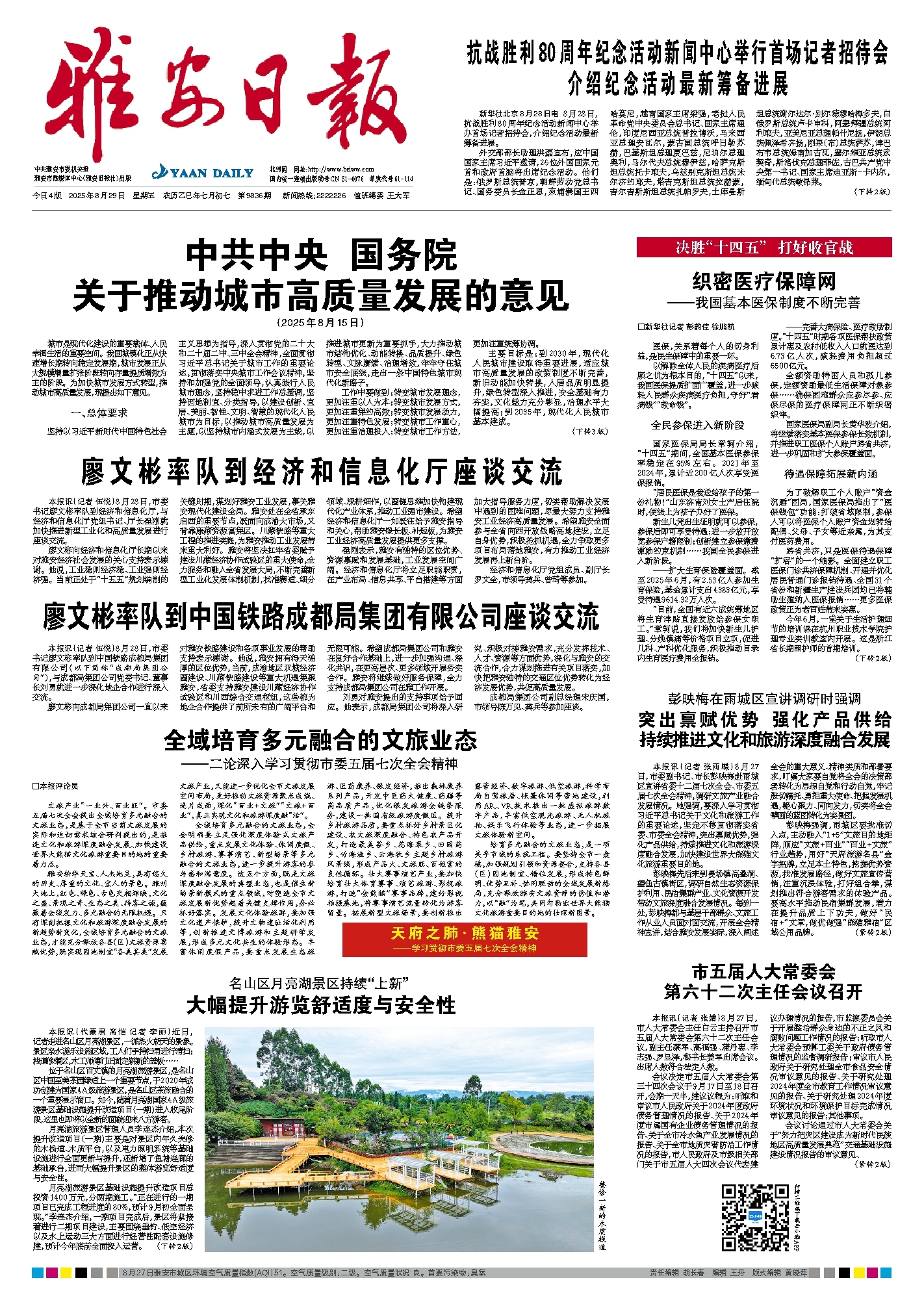 本报讯(记者 张雨蝶)8月27日,市委副书记、市长彭映梅赴雨城区宣讲省委十二届七次全会、市委五届七次全会精神,调研文旅产业融合发展情况。她强调,要深入学习贯彻习近平总书记关于文化和旅游工作的重要论述,坚定不移贯彻落实省委、市委全会精神,突出禀赋优势,强化产品供给,持续推进文化和旅游深度融合发展,加快建设世界大熊猫文化旅游重要目的地。