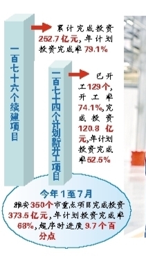 9月4日,记者从市发展和改革委员会获悉,今年1至7月,雅安350个市重点项目完成投资373.5亿元,年计划投资完成率68%,超序时进度9.7个百分点。其中,176个续建项目累计完成投资252.7亿元,年计划投资完成率79.1%;174个计划新开工项目已开工129个,开工率74.1%,新开工项目完成投资120.8亿元,年计划投资完成率52.5%。