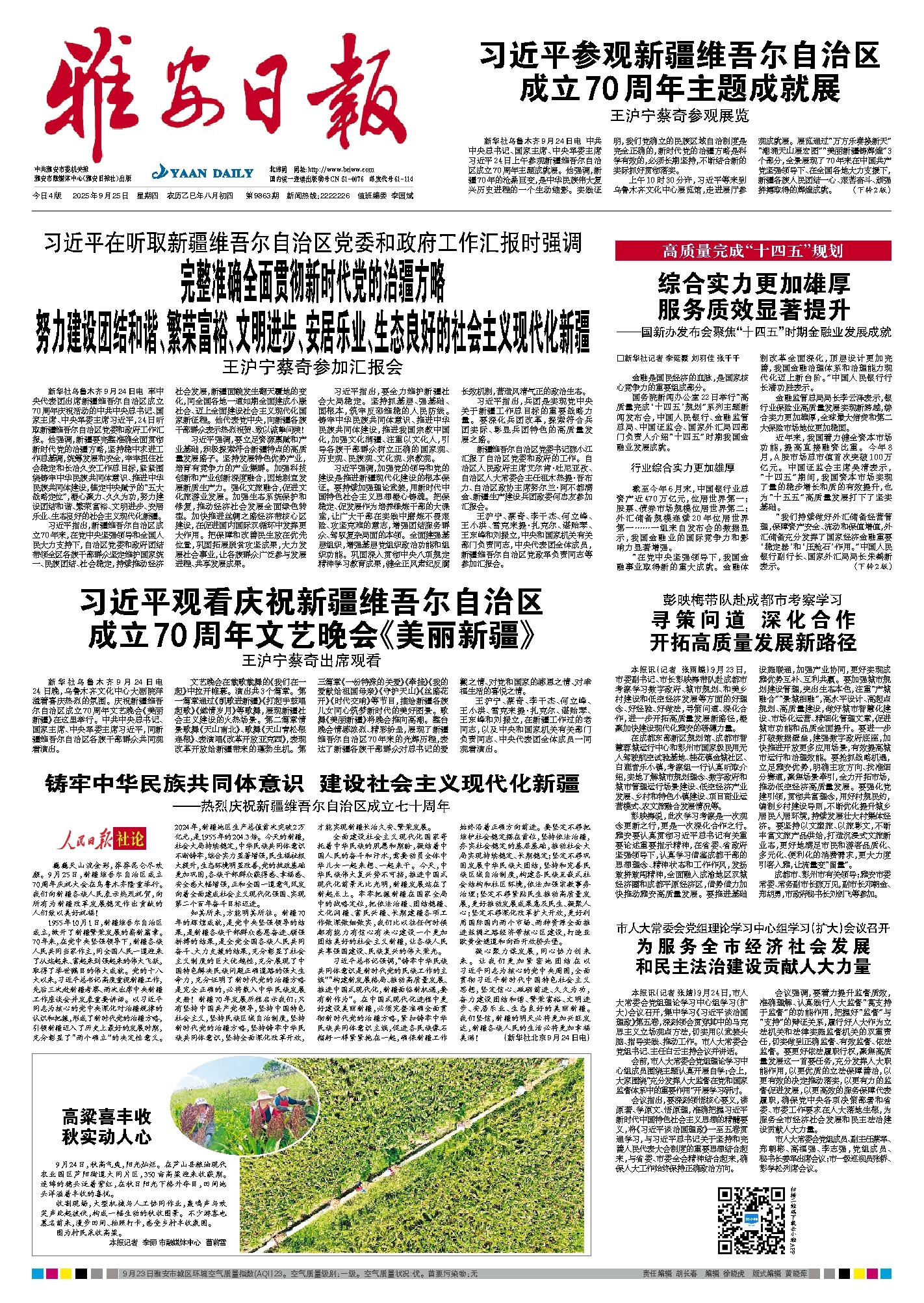 新华社乌鲁木齐9月24日电 率中央代表团出席新疆维吾尔自治区成立70周年庆祝活动的中共中央总书记、国家主席、中央军委主席习近平,24日听取新疆维吾尔自治区党委和政府工作汇报。他强调,新疆要完整准确全面贯彻新时代党的治疆方略,坚持稳中求进工作总基调,统筹发展和安全,牢牢扭住社会稳定和长治久安工作总目标,紧紧围绕铸牢中华民族共同体意识、推进中华民族共同体建设,锚定中央赋予的“五大战略定位”,凝心聚力、久久为功,努力建设团结和谐、繁荣富裕、文明进步、安居乐业、生态良好的社会主义现代化新疆。