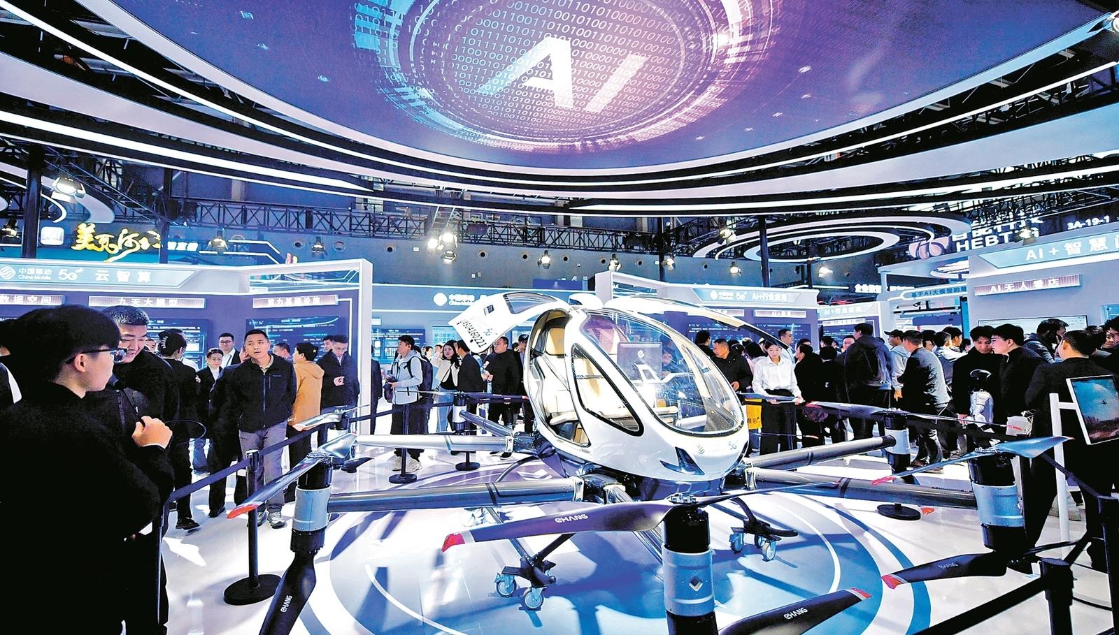 图为10月17日,观众在博览会上了解一款可载人飞行器。