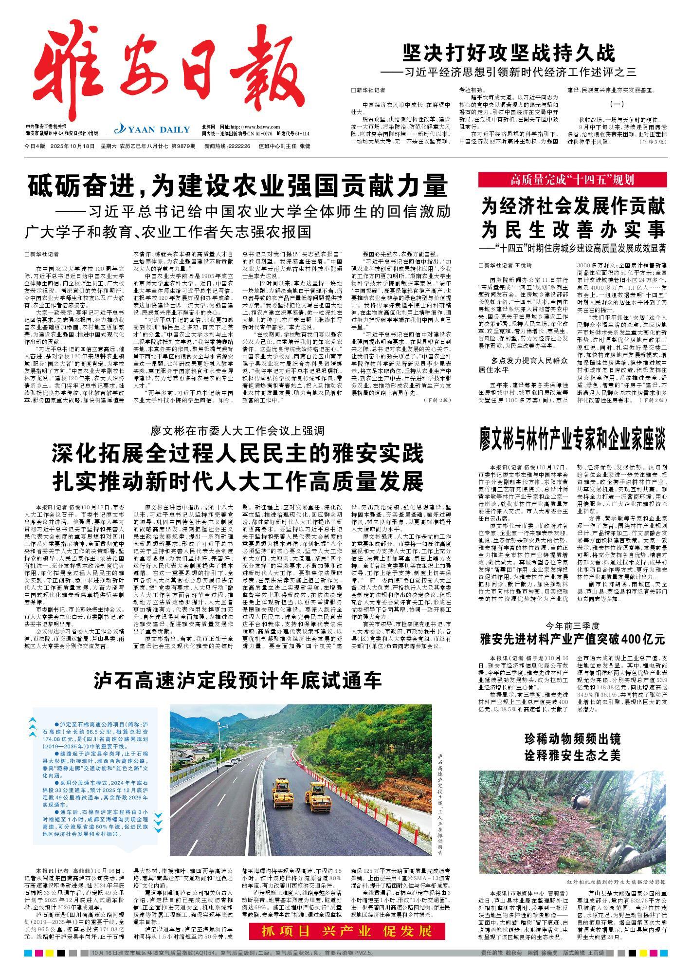 本报讯(记者 伍悦)10月17日,市委书记廖文彬在雅与中国林学会竹子分会副理事长方伟,东阳市黄家竹编工艺研究院院长、总设计师黄学敏等林竹产业专家和企业家一行座谈,就我市林竹产业高质量发展进行深入交流。市人大常委会主任白云出席。