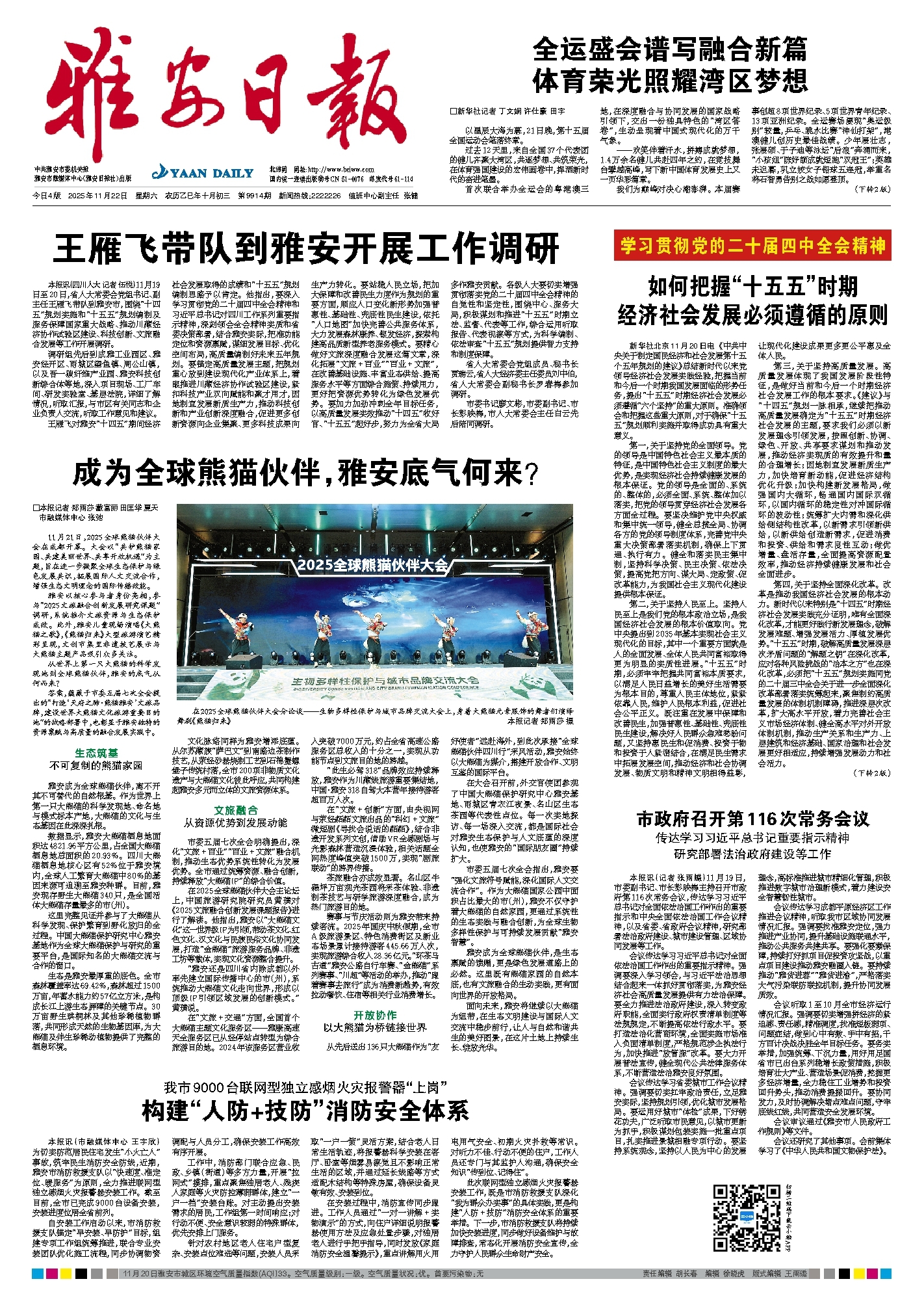 王雁飞对雅安“十四五”期间经济社会发展取得的成绩和“十五五”规划编制思路予以肯定。他指出,要深入学习贯彻党的二十届四中全会精神和习近平总书记对四川工作系列重要指示精神,深刻领会全会精神实质和省委决策部署,结合雅安实际,把准功能定位和资源禀赋,谋细发展目标、优化空间布局,高质量编制好未来五年规划。要锚定高质量发展主题,把规划重心放到建设现代化产业体系上,着眼推进川藏经济协作试验区建设,紧扣科技产业双向赋能和聚才用才,因地制宜发展新质生产力,推动科技创新和产业创新深度融合,促进更多创新资源向企业集聚、更多科技成果向生产力转化。要站稳人民立场,把加大保障和改善民生力度作为规划的重要方面,顺应人口变化新形势加强普惠性、基础性、兜底性民生建设,依托“人口地图”加快完善公共服务体系,大力发展森林康养、银发经济,探索构建高品质新型养老服务模式。要精心做好文旅深度融合发展这篇文章,深化拓展“文旅+百业”“百业+文旅”,在改善基础设施、丰富业态供给、提高服务水平等方面综合施策、持续用力,更好把资源优势转化为绿色发展优势。要加力加劲冲刺全年目标任务,以高质量发展实效推动“十四五”收好官、“十五五”起好步,努力为全省大局多作雅安贡献。各级人大要切实增强贯彻落实党的二十届四中全会精神的自觉性和坚定性,围绕中心、服务大局,积极谋划和推进“十五五”时期立法、监督、代表等工作,综合运用听取报告、代表视察等方式,为科学编制、依法审查“十五五”规划提供智力支持和制度保障。