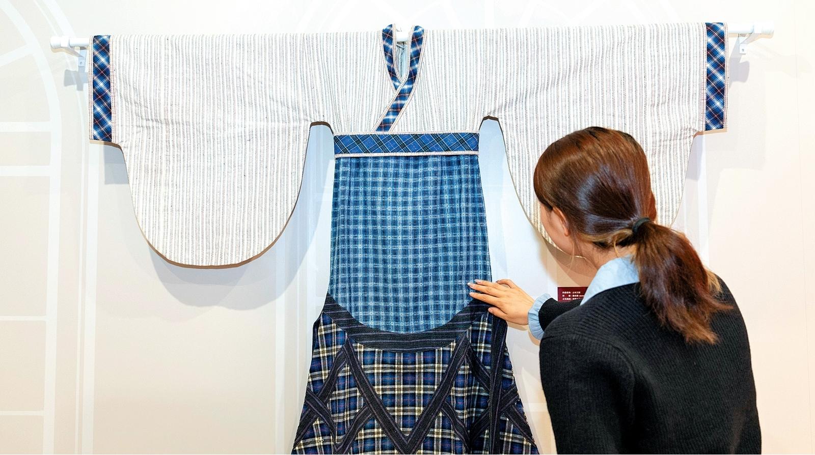 这是11月21日在北京故宫文创融合馆举行的“海派匠心·艺韵共融”上海市残疾人文化艺术作品展上拍摄的“土布汉服”作品。