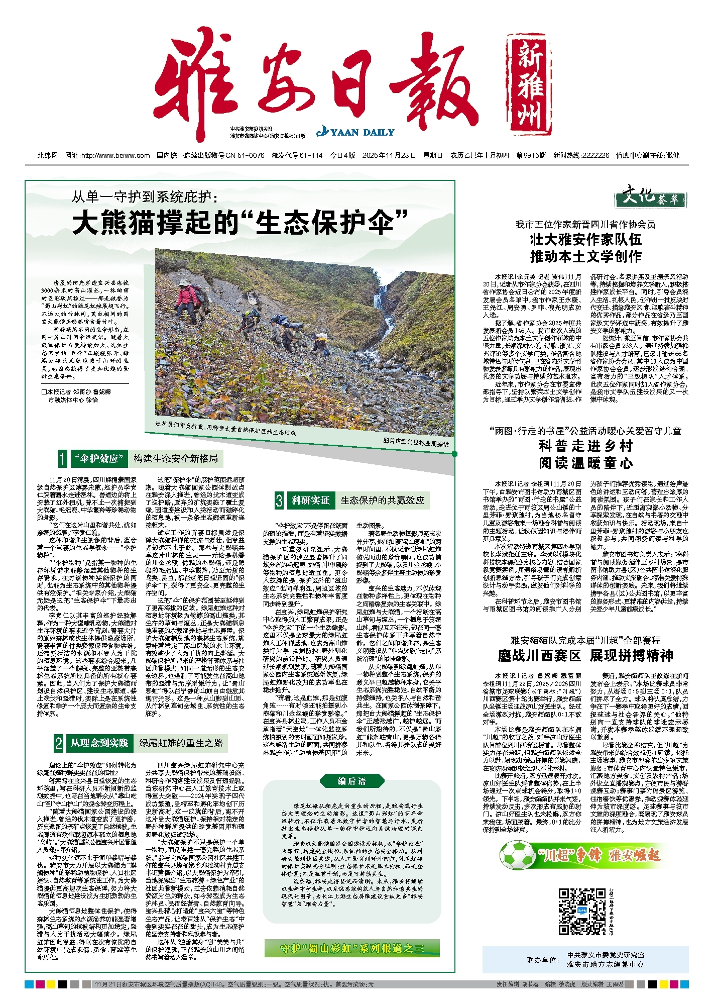 这条路,雅安走得坚定而清晰。未来,雅安将继续以生命守护生命,以系统思维构筑人与自然和谐共生的现代化图景,为长江上游生态屏障建设贡献更多“雅安智慧”与“雅安力量”。