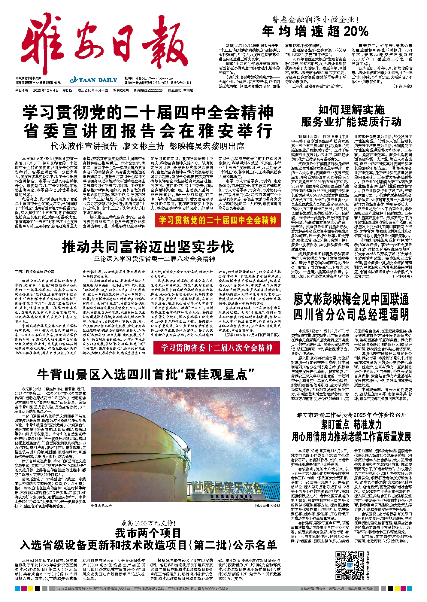 廖文彬、彭映梅代表市委、市政府对谭明一行的到来表示欢迎,对中国联通四川省分公司长期支持、积极参与雅安发展表示感谢。廖文彬说,当前雅安正深入学习贯彻党的二十届四中全会和省委十二届八次全会精神,积极抢抓国省战略机遇,全力以赴拼经济搞建设,因地制宜发展新质生产力,不断塑造高质量发展新动能。希望双方在前期良好合作的基础上,充分发挥各自优势,在发展数字经济、建设智慧城市等方面开展更深层次合作,实现更高水平互利共赢。雅安将一如既往提供优质的服务、创造良好的环境,推动政企合作结出更多硕果。