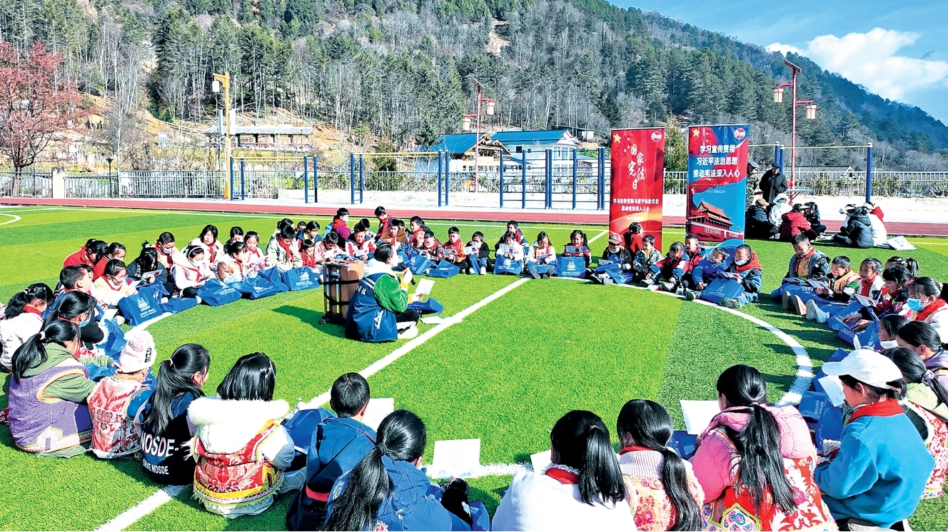 “齐尊宪齐守法,民族团结开新花。”主席台上,两名学生用藏汉双语领诵宪法条文,台下师生跟读声音整齐有力,法治庄严与民族风情交融,让宪法精神在校园中回响。