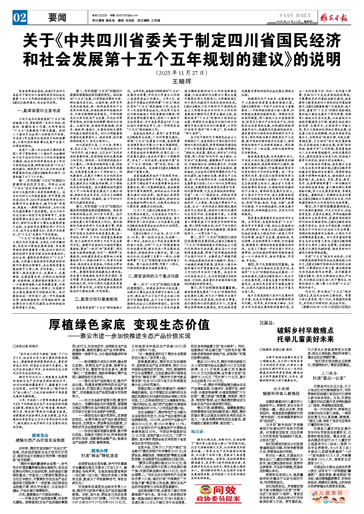 青山不语,绿意绵延。随着提案建议的持续落实与机制创新的深入推进,雅安的绿水青山正焕发出前所未有的生机与活力,一条具有雅安特色的生态富民、绿色崛起之路愈加清晰、愈加宽广。