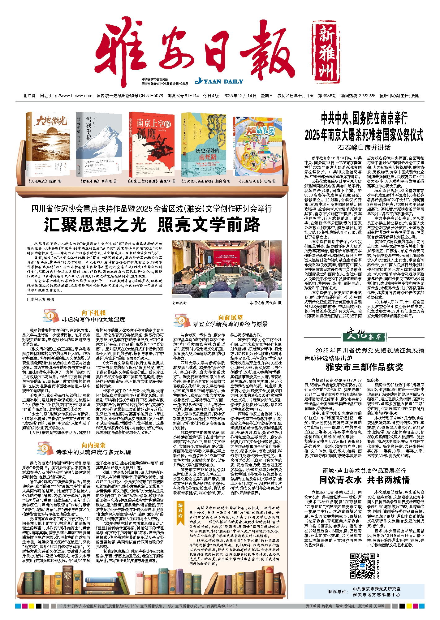 从陈果笔下为小人物立传的“街角歌者”,到何文以“草”为核心意象建构的万物有灵世界;从李存刚《雪夜手稿》中高原行医的“逐日记”,到黑辞诗中充满“00后”代际特征的智性表达——雅安作家们以各自的方式,让文学成为一束束照向现实的“光”。