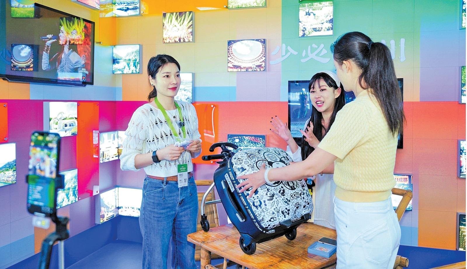 雅安文旅集团工作人员向参展嘉宾推介熊猫行李箱图片由市文化广播电视体育和旅游局提供