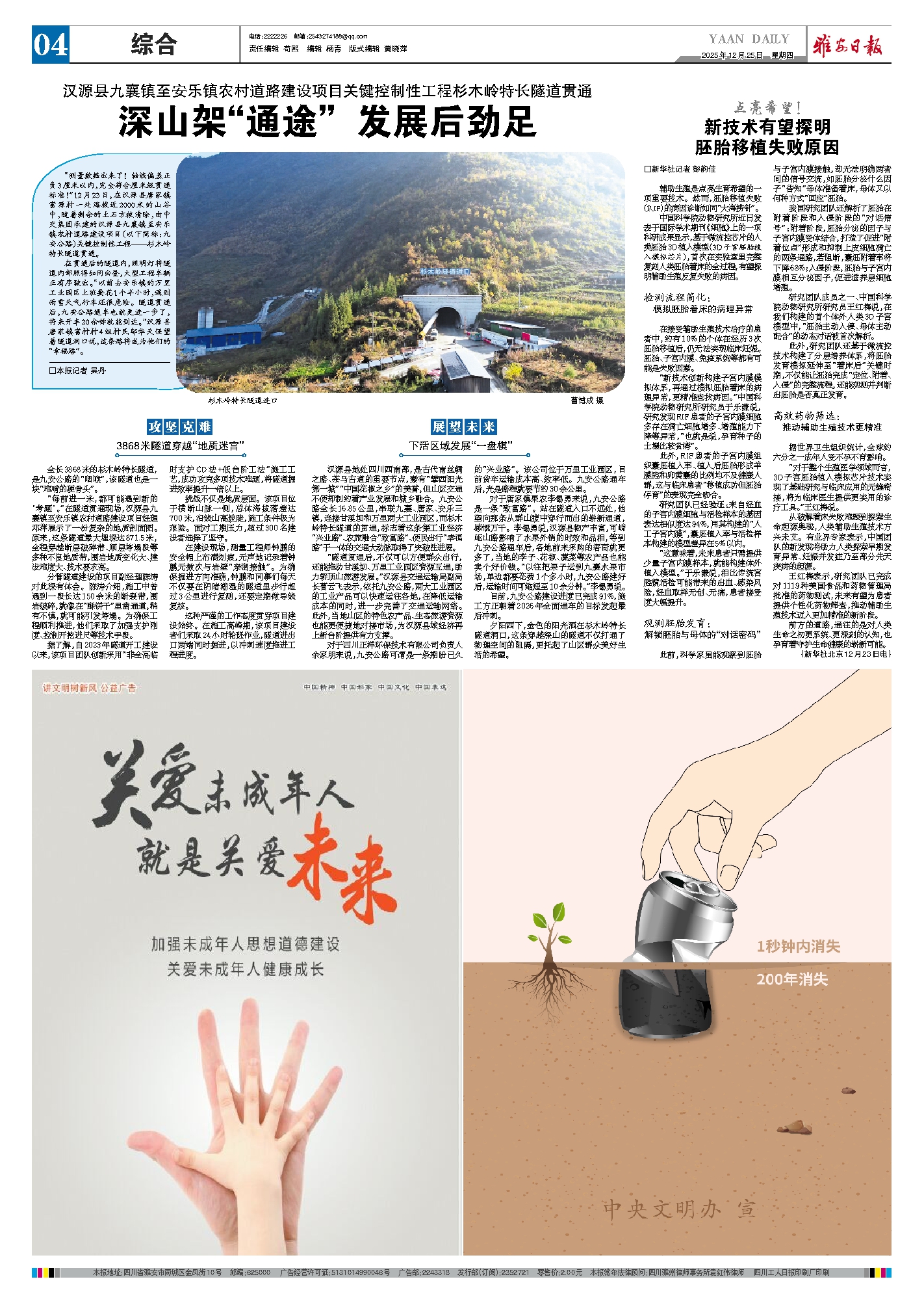 “测量数据出来了!轴线偏差正负3厘米以内,完全符合厘米级贯通标准!”12月23日,在汉源县唐家镇富源村一处海拔近2000米的山谷中,随着剩余的土石方被清除,由中交集团承建的汉源县九襄镇至安乐镇农村道路建设项目(以下简称:九安公路)关键控制性工程——杉木岭特长隧道贯通。