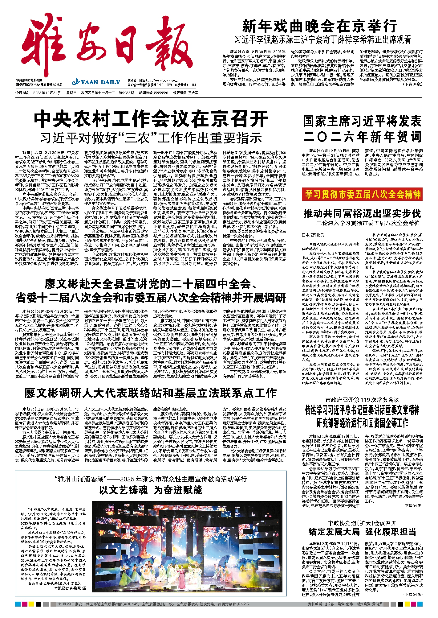 会议传达学习习近平总书记在中共中央政治局会议、党外人士座谈会、中央经济工作会议上的重要讲话精神,习近平总书记重要文章《扩大内需是战略之举》精神,国务院常务会议及省委常委会会议、省委经济工作会议等有关会议要求,听取当前经济运行情况汇报。强调要提高政治站位,迅速把思想和行动统一到党中央、省委对当前形势的判断和明年经济工作的部署要求上来,一体学习领会、一体贯彻落实。要全面冲刺年度目标任务,坚持“拼”字当头、“干”字为先,统筹做好指标收口、政策收官、资金收闸、投资收尾等工作,坚决确保“十四五”圆满收官。要坚定信心决心,坚持“抓当前、拼三年、干五年、谋十年”,衔接对标市委五届八次全会明确的“十五五”目标任务,科学谋划2026年全市经济工作,确保“十五五”良好开局。要强化统筹兼顾,做好节日期间促消费扩内需、民生保障、安全稳定、廉洁自律、值班值守等工作。