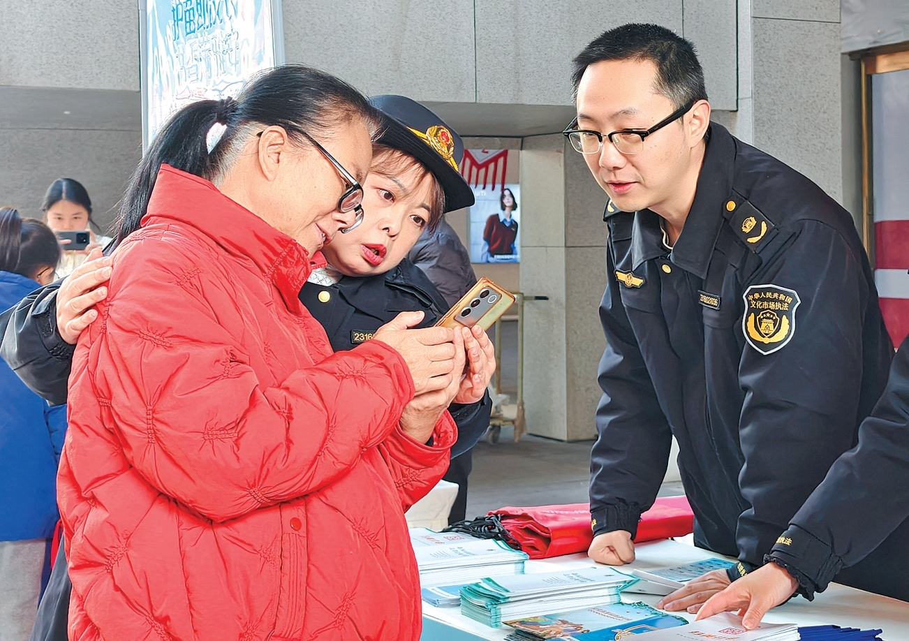 普法宣传互动区,市文化市场综合行政执法支队工作人员面对面为市民讲解侵权盗版举报渠道、文化市场违规行为识别方法等。同时,市民扫码参与普法知识有奖问答,在趣味答题中提升法治意识。