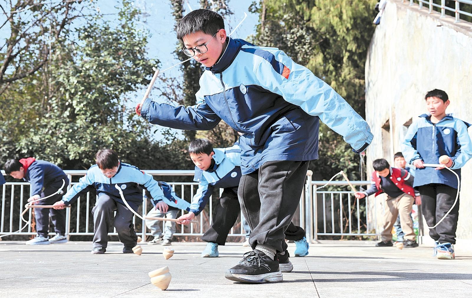 1月9日,诸暨市陶朱街道白门完小的学生在操场上打陀螺。近期,为丰富学生课间生活、传承中华优秀传统文化,浙江省诸暨市陶朱街道中心学校下属各小学开设了传统游戏课程,打陀螺、跳房子、踩高跷等多项传统游戏让学生们玩得不亦乐乎。