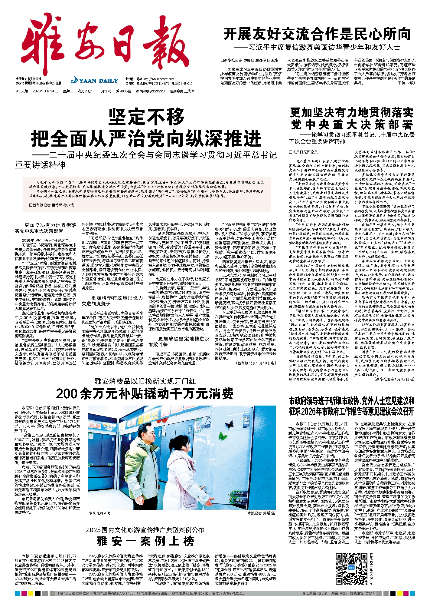 会议通报了2025年民生实事完成情况、《2026年市级民生实事项目建议名单》及《雅安市国民经济和社会发展第十五个五年规划纲要草案(征求意见稿)》起草情况。市政协、各民主党派、市工商联、无党派人士、市政协委员代表先后踊跃发言,就相关工作提出意见和建议。