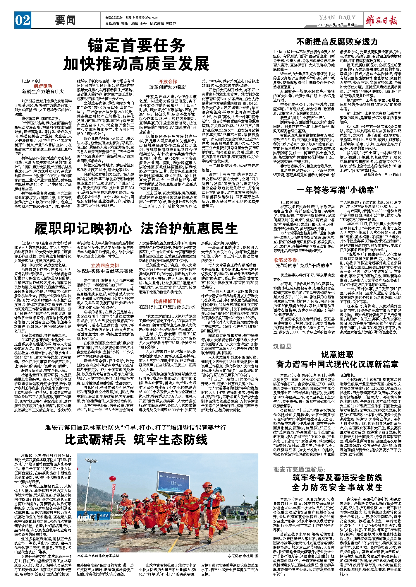 (上接01版)监督是宪法和法律赋予人大的重要职权。市人大常委会始终将服务中心大局作为履职主题贯穿工作全过程,切实将监督效能转化为雅安现代化建设的发展动能。