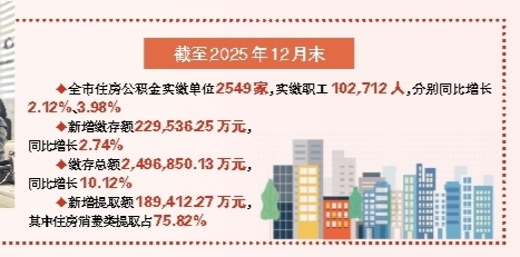 截至2025年12月末,全市实缴单位2549家,实缴职工102,712人,分别同比增长2.12%、3.98%;新增缴存额229,536.25万元,同比增长2.74%;缴存总额2,496,850.13万元,同比增长10.12%。新增提取额189,412.27万元,其中住房消费类提取占75.82%,有效保障职工基本住房需求。