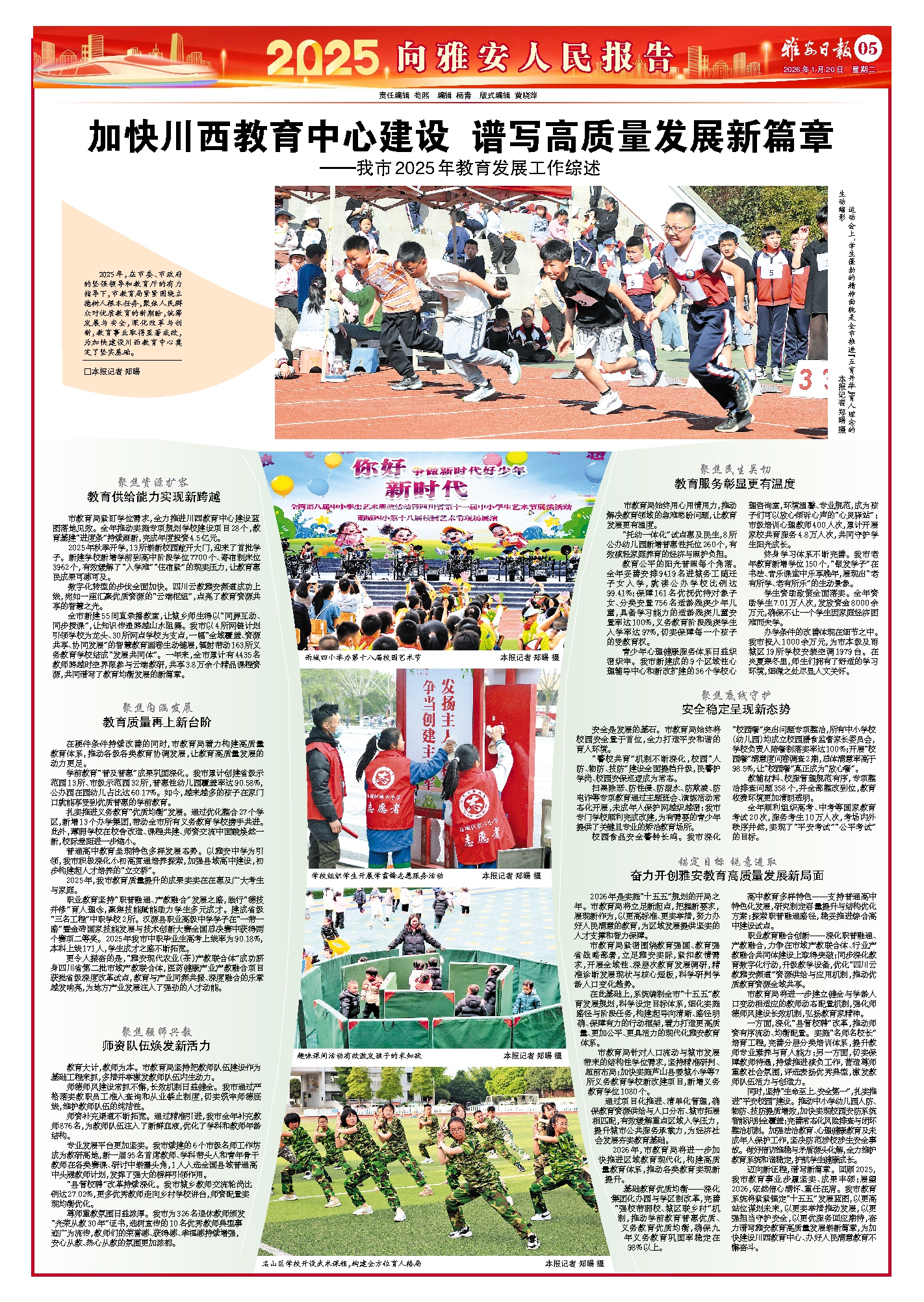 迈向新征程,谱写新篇章。回顾2025,我市教育事业步履坚实、成果丰硕;展望2026,依然信心满怀、重任在肩。我市教育系统将紧紧锚定“十五五”发展蓝图,以更高站位谋划未来,以更实举措推动发展,以更强担当守护安全,以更优服务回应期待,奋力谱写雅安教育高质量发展崭新篇章,为加快建设川西教育中心、办好人民满意教育不懈奋斗。