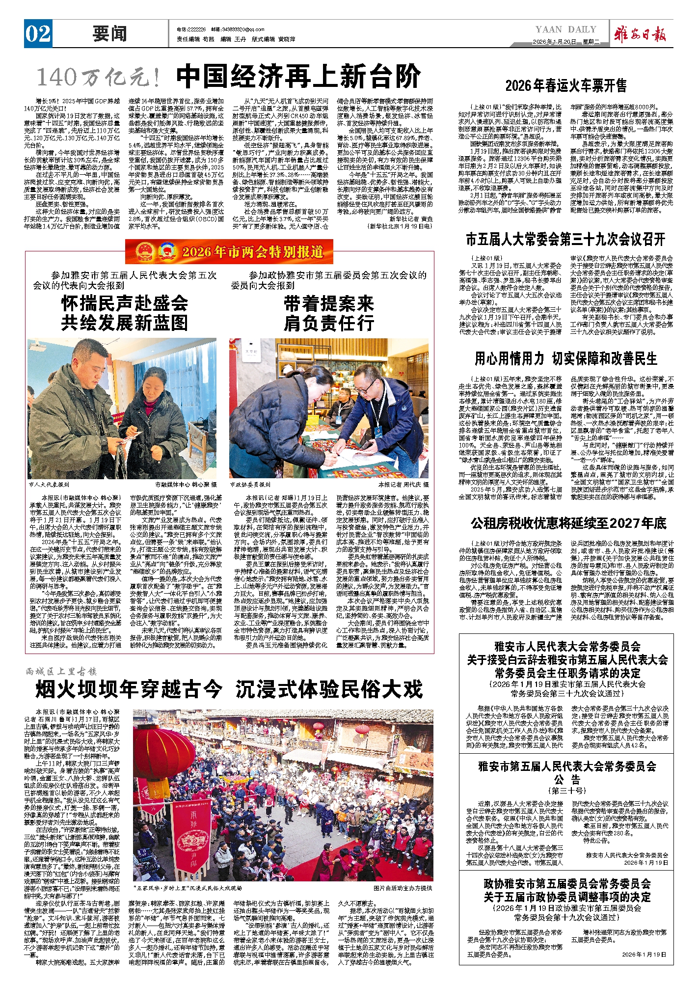 2026年是“十五五”开局之年。在这一关键历史节点,代表们带来的议案建议,为雅安未来五年高质量发展锚定方向、注入动能。从乡村振兴到民生改善,从城市建设到产业发展,每一份建议都凝聚着代表们深入的调研与思考。