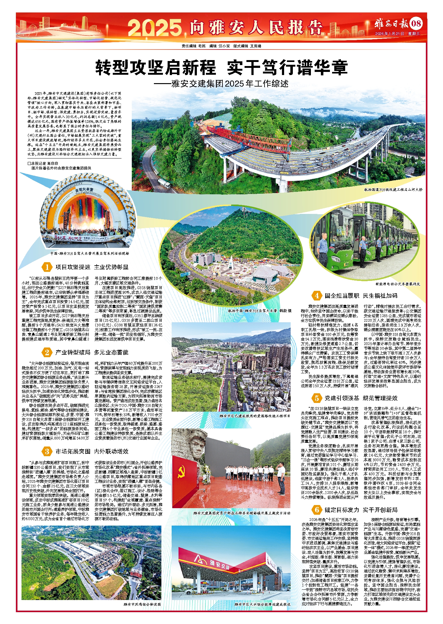 强化治理提效,筑牢发展根基。以党建为引领,建强管理队伍,市场化引进急需人才,深化廉洁建设。通过优化融资、集中采购降本增效,妥善处置历史遗留问题,完善子公司考核体系,强化合规与风险防控。坚守国企担当、深耕民生领域,推动主要经济指标稳中向好,奋力打造区域领先的交通建设龙头企业,为雅安建设川西综合交通枢纽贡献力量。