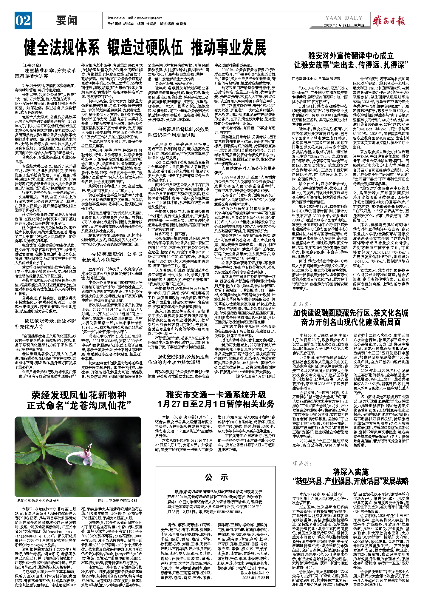 本报讯(市融媒体中心 曹莉雪)1月28日,记者从荥经县大相岭自然保护区管护中心获悉,其与西昌学院罗强研究团队在龙苍沟国家森林公园开展调查时,发现一种凤仙花属新物种,并正式命名为“龙苍沟凤仙花(Impatiens longcanggouensis Q. Luo)”。相关研究成果已于2026年1月在国际植物分类学期刊《PhytoKeys》上发表。