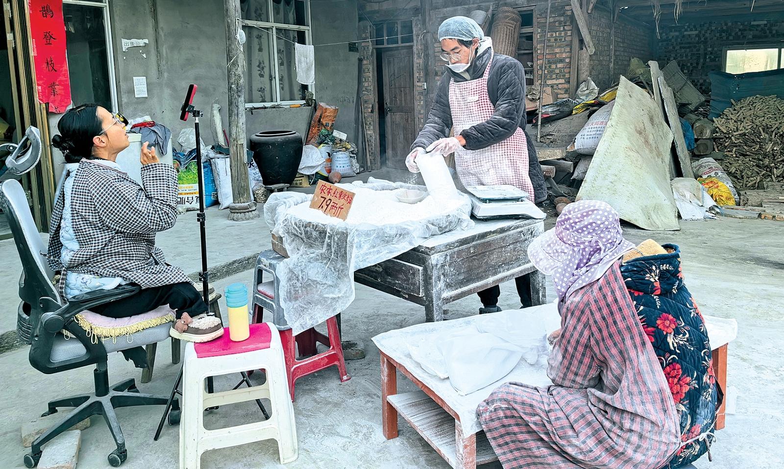 当日,张艳要销售的是农家红薯淀粉。她搭好直播设备后,镜头对准了姐姐张琼,张琼在前面展示红薯淀粉,张艳则在镜头后滔滔不绝进行介绍。2小时里,张艳不间断地介绍着产品特点,同时她也关注着商品销售的情况。