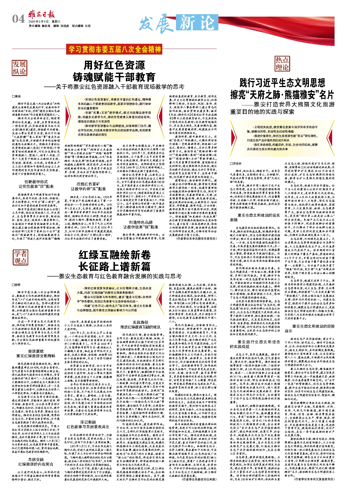 为进一步丰富红色文化教育内涵,强化城市形象宣传推广,助推生态文化旅游融合高质量发展,雅安需充分整合绿色生态资源与红色文化资源,推动生态教育与红色教育深度互融,为全国红色旅游重要目的地建设注入强劲动力。