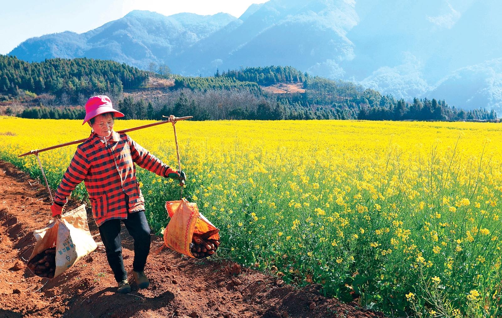 图为2月4日,农民在云南省腾冲市明光镇凤凰村凤凰山挑运刚采挖的山药。