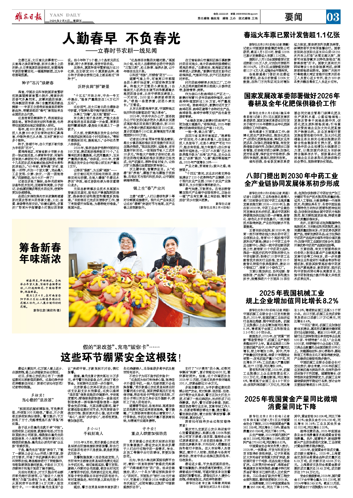 在四川省宜宾市南溪区,“稻麦轮作”的田间,冬小麦长势喜人,在当地农技人员指导下,这里小麦亩产可达700斤,粮农有收益,地力有提升;在山东省潍坊市临朐县,一只只“小灰鹅”已从初级养殖升级为“出海”农产品,龙头企业新上“冰果”鹅肝、“心慕”鹅肝等高端产品,2025年产值增长18%……