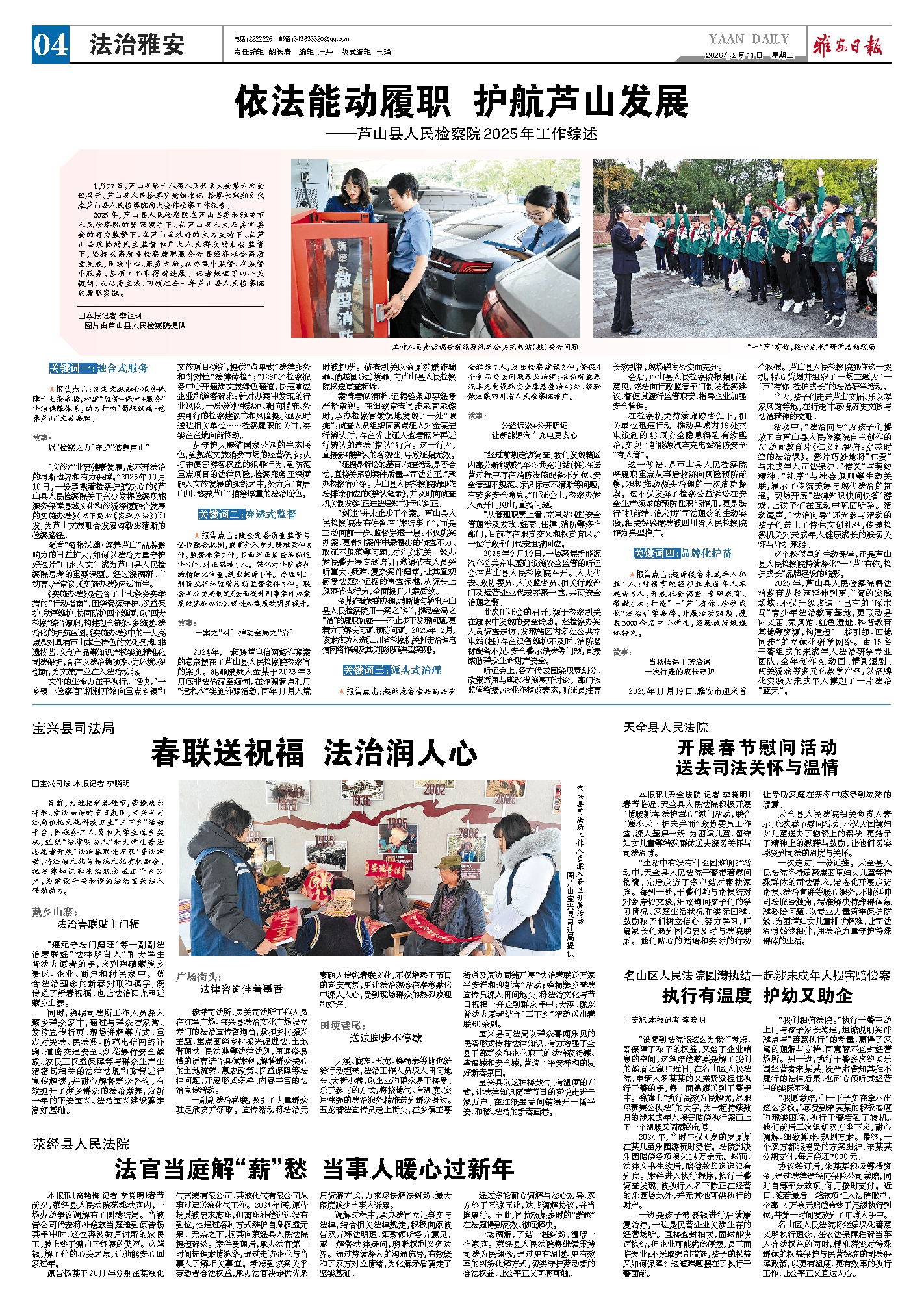 2025年,芦山县人民检察院在芦山县委和雅安市人民检察院的坚强领导下、在芦山县人大及其常委会的有力监督下、在芦山县政府的大力支持下、在芦山县政协的民主监督和广大人民群众的社会监督下,坚持以高质量检察履职服务全县经济社会高质量发展,围绕中心、服务大局,在办案中监督、在监督中服务,各项工作取得新进展。记者梳理了四个关键词,以此为主线,回顾过去一年芦山县人民检察院的履职实践。