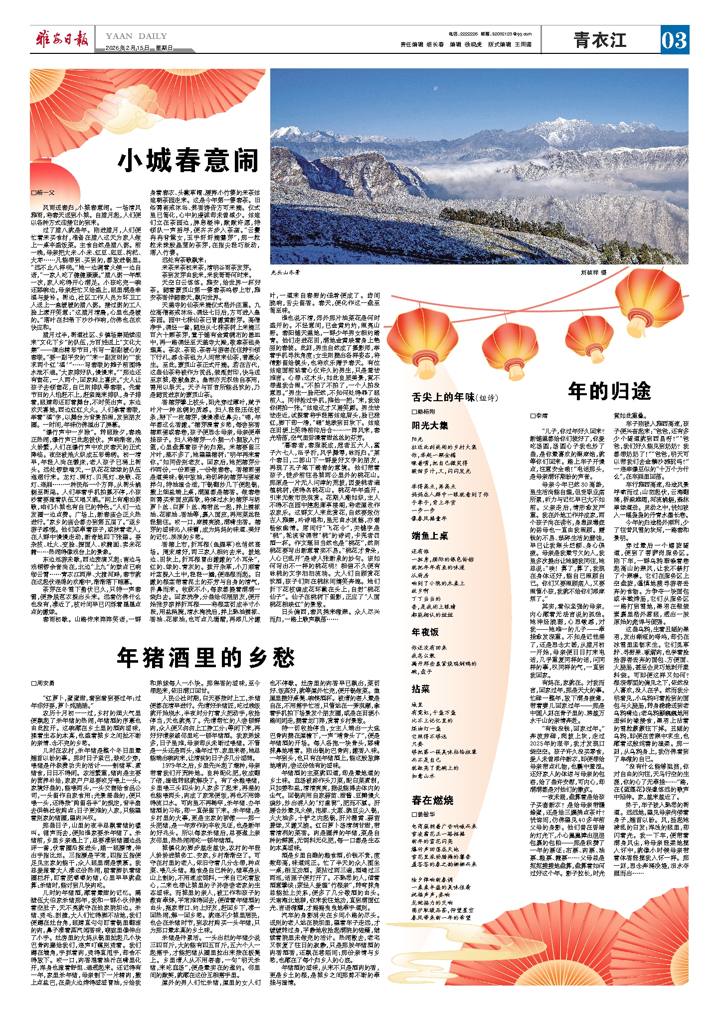 东边巡游未歇,西边表演又起;南边马戏铜锣余音尚在,北边“上九”的鼓点已响彻云霄……青衣江两岸、大渡河畔,春节就在这起伏连绵的欢潮中,渐渐落下帷幕。