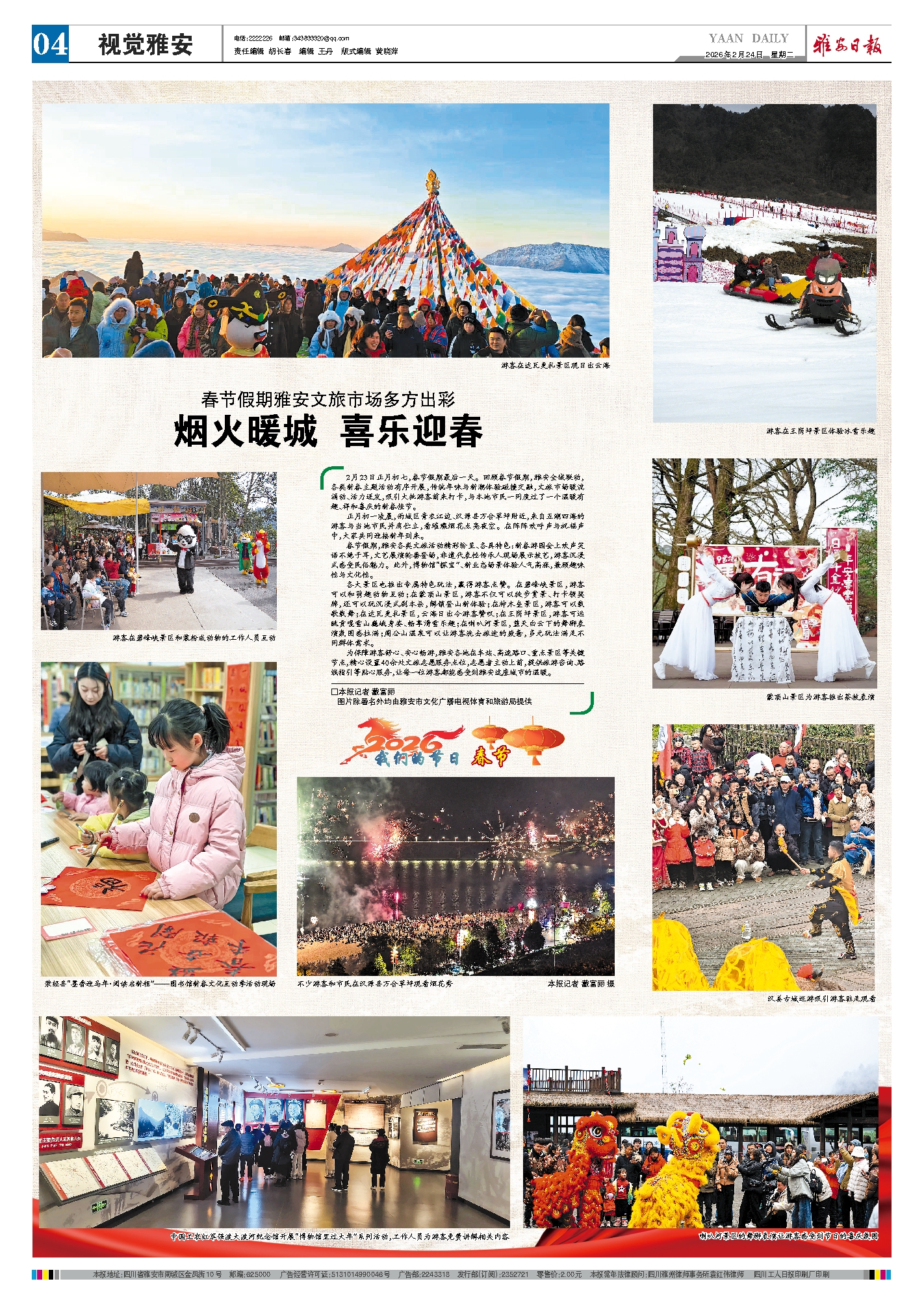 2月23日正月初七,春节假期最后一天。回顾春节假期,雅安全域联动,各类新春主题活动有序开展,传统年味与新潮体验碰撞交融,文旅市场暖流涌动、活力迸发,吸引大批游客前来打卡,与本地市民一同度过了一个温暖有趣、祥和喜庆的新春佳节。