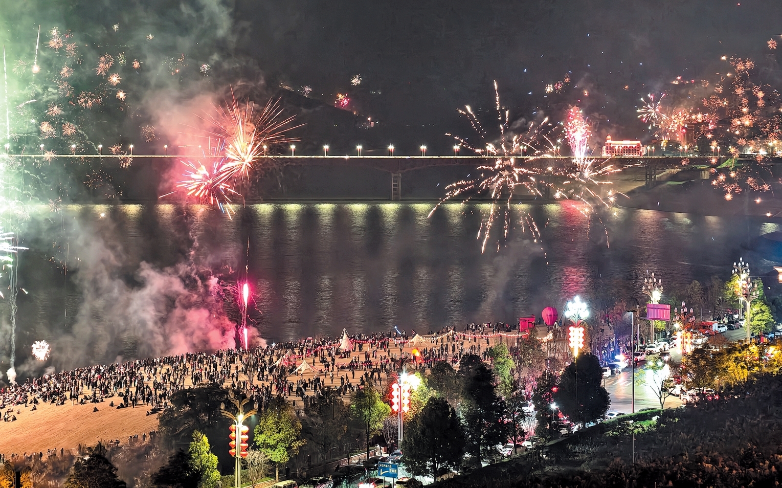 正月初一凌晨,雨城区青衣江边、汉源县万合草坪附近,来自五湖四海的游客与当地市民并肩伫立,看璀璨烟花点亮夜空。在阵阵欢呼声与祝福声中,大家共同迎接新年到来。