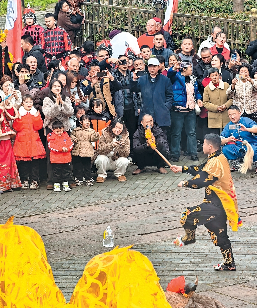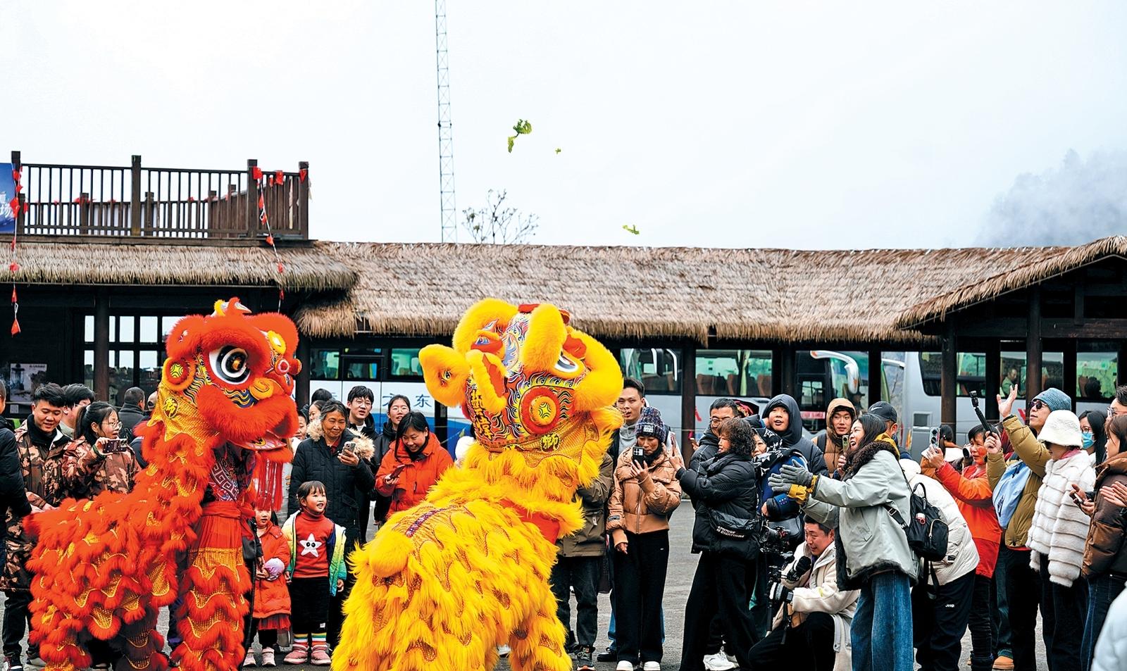 喇叭河景区的舞狮表演让游客感受到节日的喜庆氛围