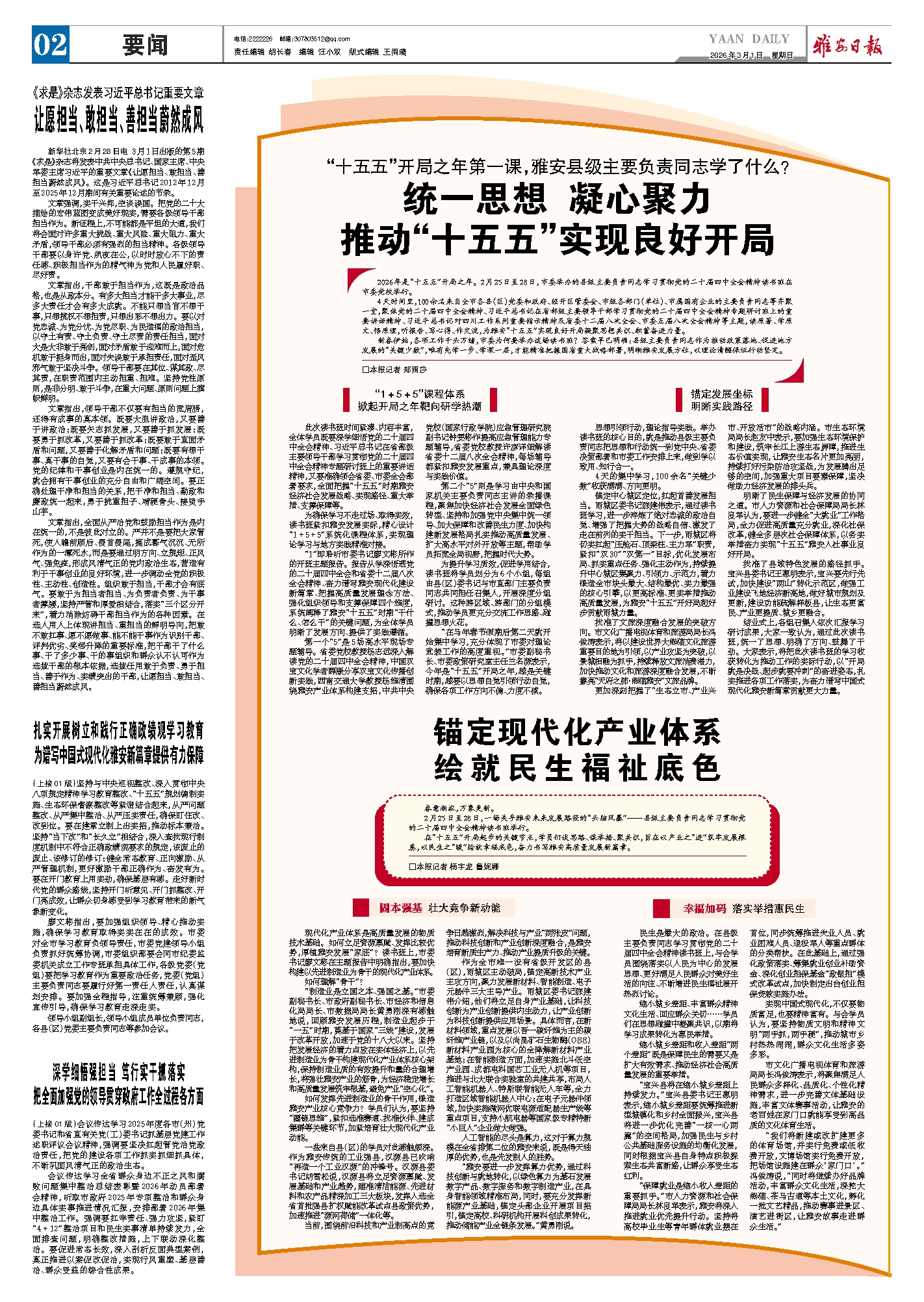 锚定中心城区定位,扛起首善发展担当。雨城区委书记陈建伟表示,通过读书班学习,进一步淬炼了绝对忠诚的政治自觉、增强了把握大势的战略自信、激发了走在前列的实干担当。下一步,雨城区将切实扛起“压舱石、顶梁柱、主力军”职责,紧扣“双30”“双第一”目标,优化发展布局、抓实重点任务、强化主动作为,持续提升中心城区集聚力、引领力、示范力,着力锻造全市块头最大、结构最优、实力最强的核心引擎,以更高标准、更实举措推动高质量发展,为雅安“十五五”开好局起好步贡献雨城力量。