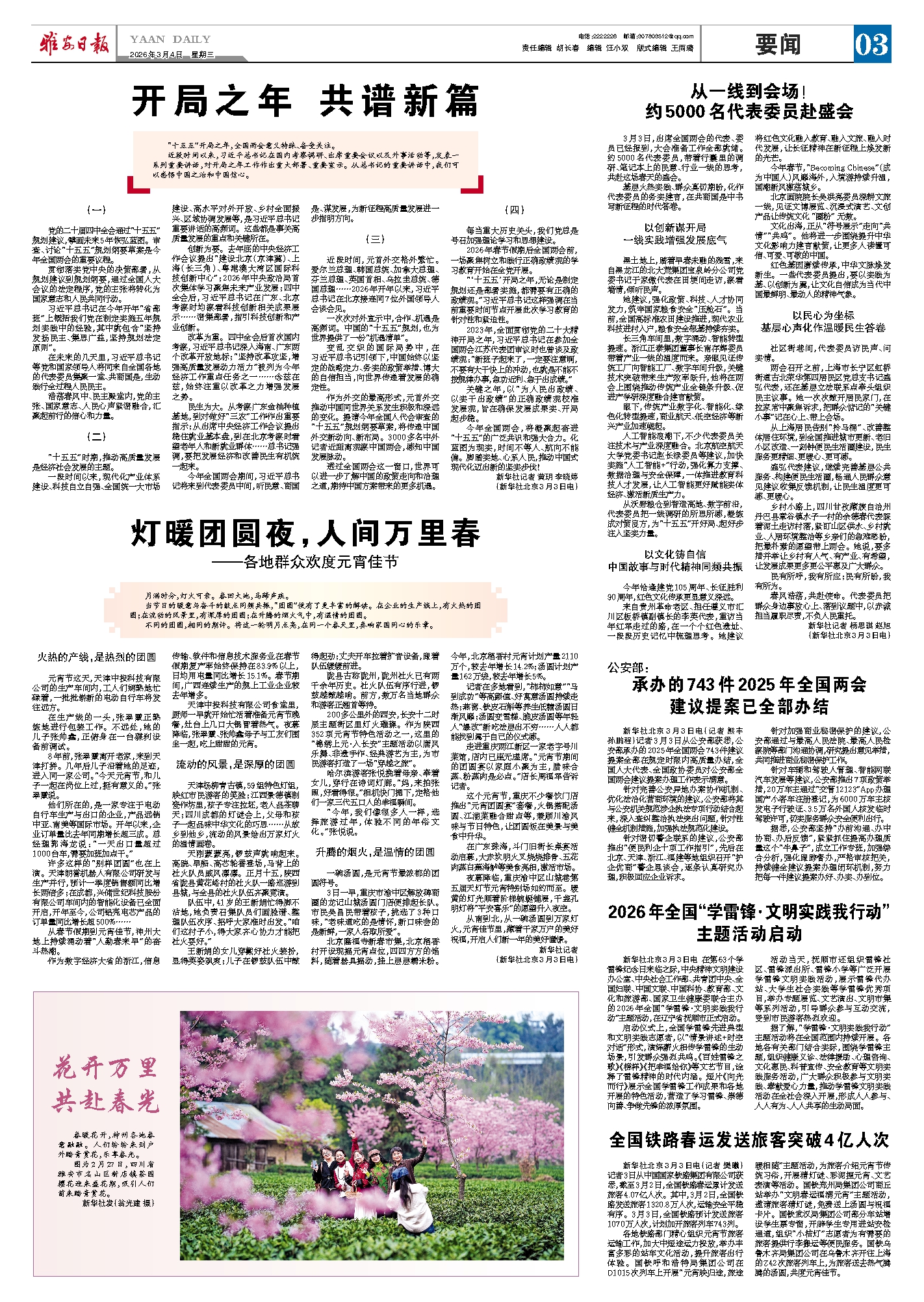 3月3日,出席全国两会的代表、委员已经报到,大会准备工作全部就绪。约5000名代表委员,带着行囊里的调研、笔记本上的民意、行业一线的思考,共赴这场春天的盛会。
