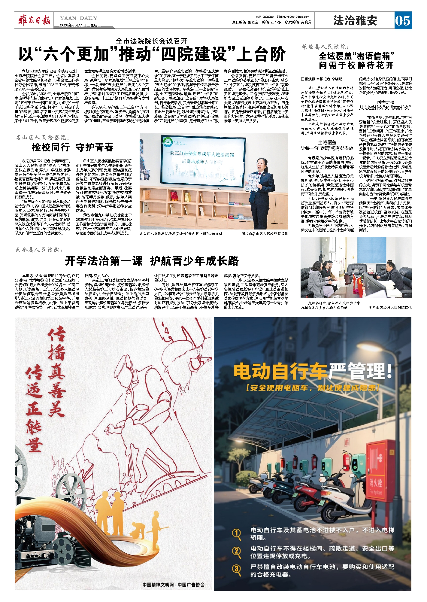 雅安市第九中学驻校检察室于2026年2月正式运行,包括法律监督工作区和法治宣讲区两部分。通过检校合作,一同构筑未成年人保护屏障,以法治力量护航未成年人健康成长。