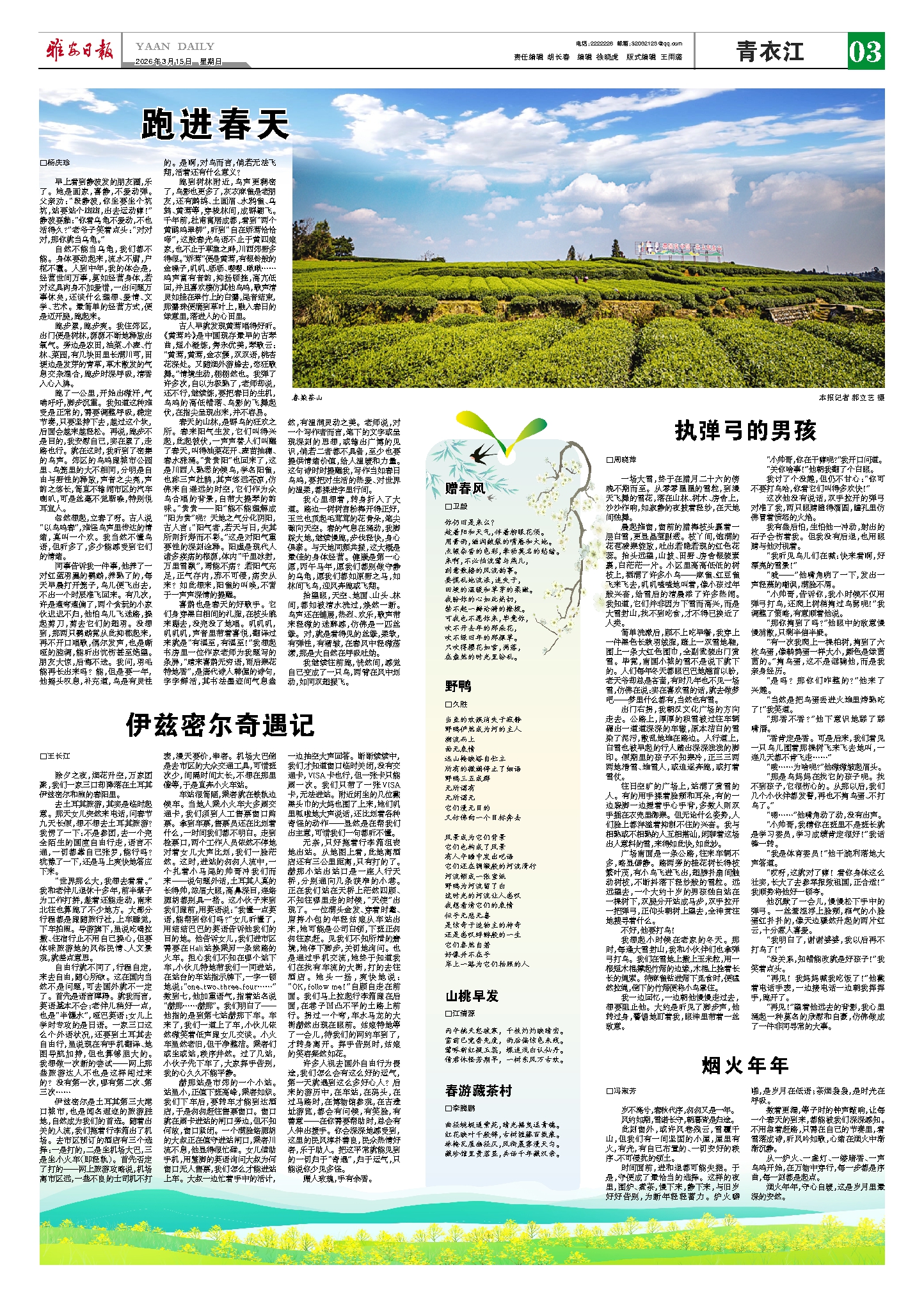 抬望眼,天空、地面、山头、林间,都如被清水洗过,焕然一新。鸟声还在铺展,热烈、欢乐,歌声带来轻微的迷醉感,仿佛是一匹丝缎。对,就是看得见的丝缎,柔软,有弹性,有褶皱,在春风中轻微荡漾,那是大自然在呼吸吐纳。