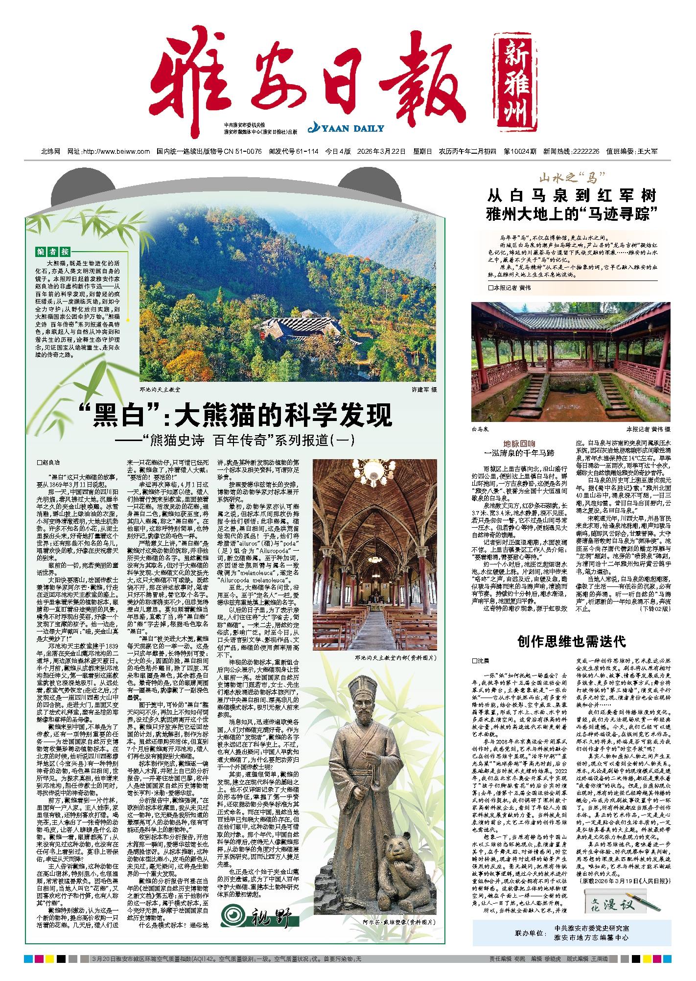 编者按:大熊猫,既是生物进化的活化石,亦是人类文明观照自身的镜子。本报即日起首发雅安作家赵良冶的非虚构新作节选——从百年前的科学发现,到曾经的疯狂猎杀;从一度濒临灭绝,到如今全力守护;从野化放归实践,到大熊猫国家公园伞护万物。“熊猫史诗 百年传奇”系列报道各具特色,串联起人与自然从冲突到和谐共生的历程,诠释生态守护理念,见证国宝从绝境重生、走向永续的传奇之路。