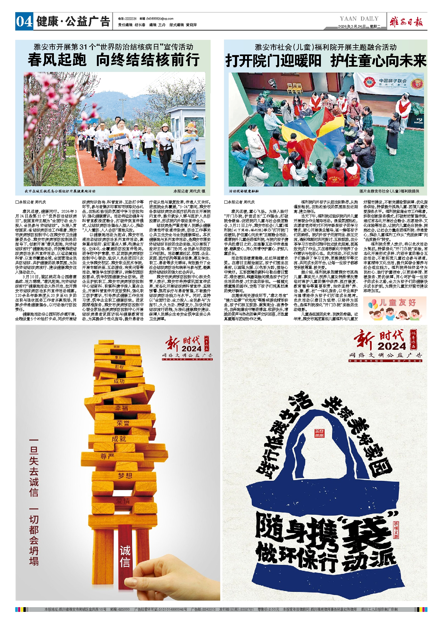 春风送暖,健康同行。2026年3月24日是第31个“世界防治结核病日”,我国宣传主题为“全面行动 全力投入 全民参与 终结结核”。为深入贯彻国家、省结核病防治工作部署,雅安市疾病预防控制中心在雅安市卫生健康委员会、雅安市疾病预防控制局的指导下,创新开展“春风起跑,向终结结核前行”健康跑活动,并统筹推进结核病防治系列宣传活动,以运动赋能科普、以宣传覆盖全域,全面营造全民共防结核、共护健康的浓厚氛围,为加快终结结核病流行、建设健康雅安注入强劲动力。
