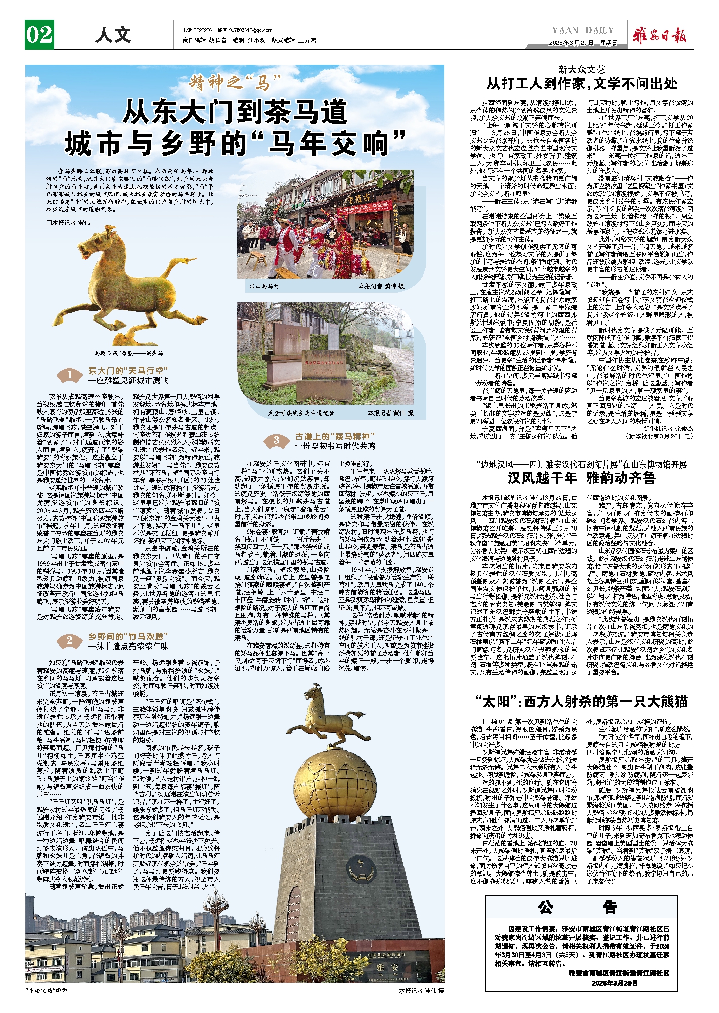 金马奔腾三江暖,彩灯高挂万户春。农历丙午马年,一种独特的“马”元素,从东大门凌空腾飞的“马踏飞燕”,到乡间地头走村串户的马马灯,再到茶马古道上沉默坚韧的历史背影,“马”早已深深嵌入雅安的城市肌理,成为雅安最富动感的马年符号。让我们沿着“马”的足迹穿行雅安,在城市的门户与乡村的烟火中,捕捉这座城市的蓬勃气象。