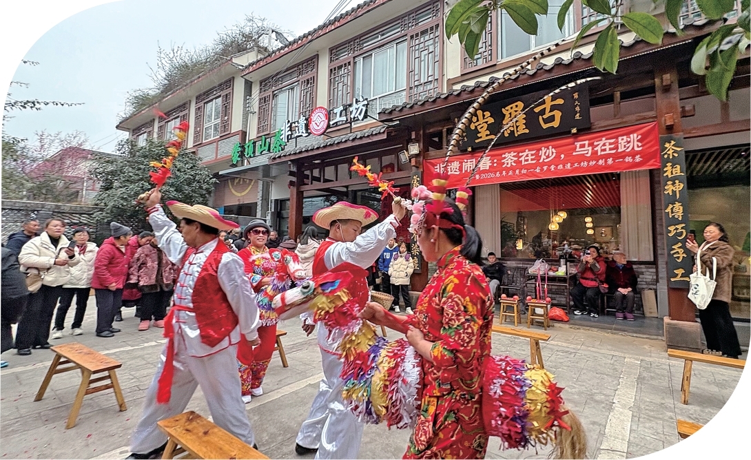 正月初一清晨,茶马古城还未完全苏醒,一阵清脆的锣鼓声便打破了宁静。名山马马灯非遗代表性传承人杨远刚正带着他的队伍,为当天的演出做最后的准备。纸扎的“竹马”色彩鲜艳,马头高昂,马尾轻摆,仿佛即将奔腾而起。只见那竹编的“马儿”栩栩如生,马眼用半个鸡蛋壳制成,乌黑发亮;马鬃用彩纸剪成,随着演员的跑动上下翻飞;马脖子上的铜铃铛“叮当”作响,与锣鼓声交织成一曲欢快的乐章……