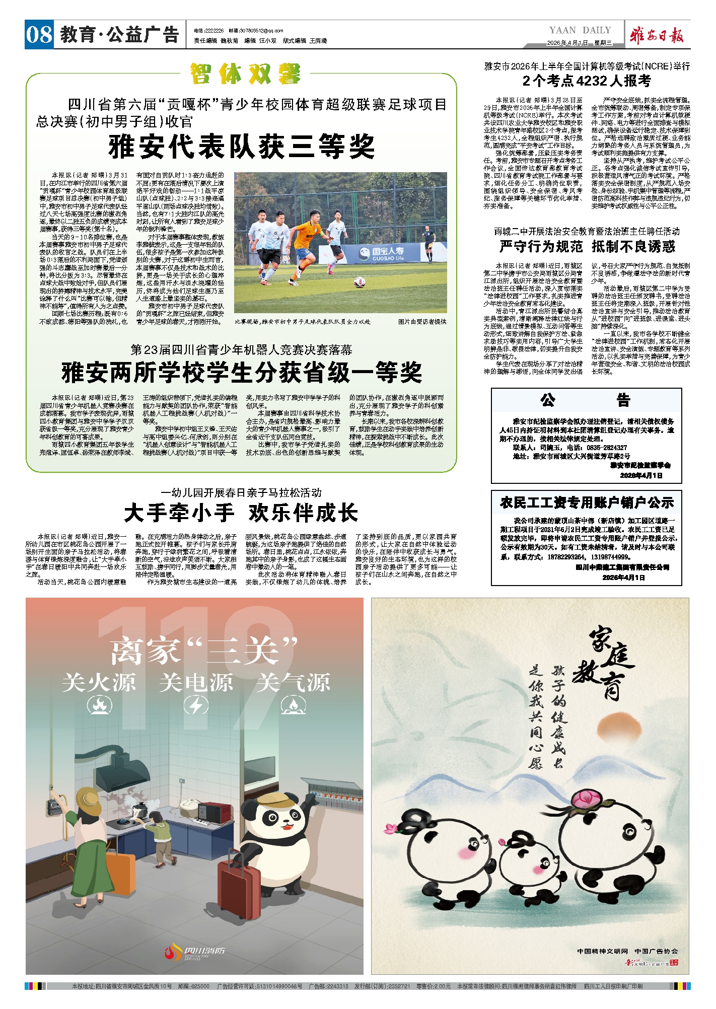 本报讯(记者 郑暘)3月28日至29日,雅安市2026年上半年全国计算机等级考试(NCRE)举行。本次考试共设四川农业大学雅安校区和雅安职业技术学院青年路校区2个考点,报考考生4232人,全程组织严密、执行规范,圆满完成“平安考试”工作目标。