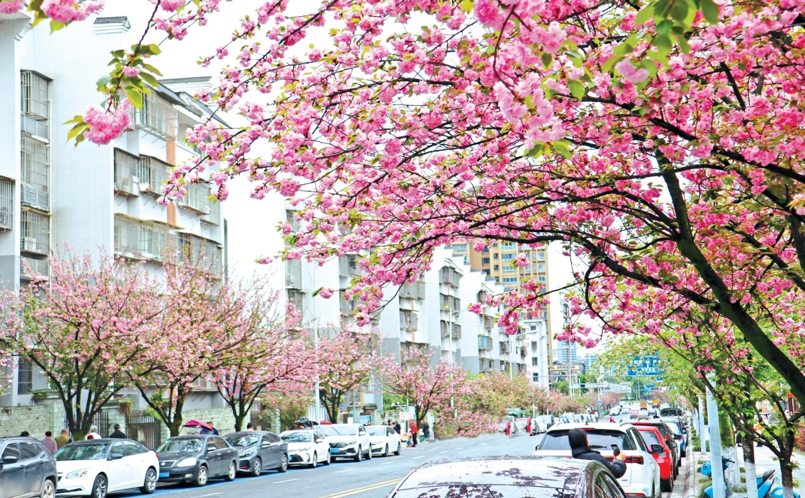 近日,雨城区孝廉街、怡居路等路段的晚樱盛放,一树树繁花压弯枝头,如云似锦,将城区街道装点成春日里的“浪漫花廊”,引得过往市民驻足拍照。