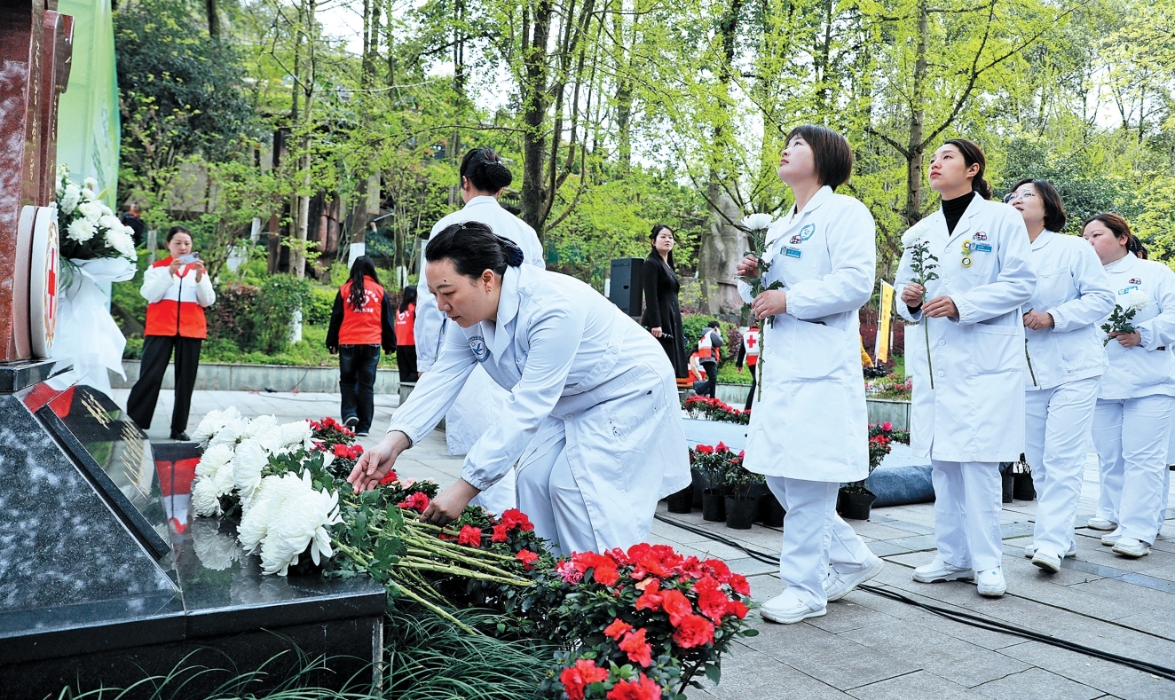 医护人员向遗体和器官捐献者纪念碑献花 本报记者 周代庆 摄