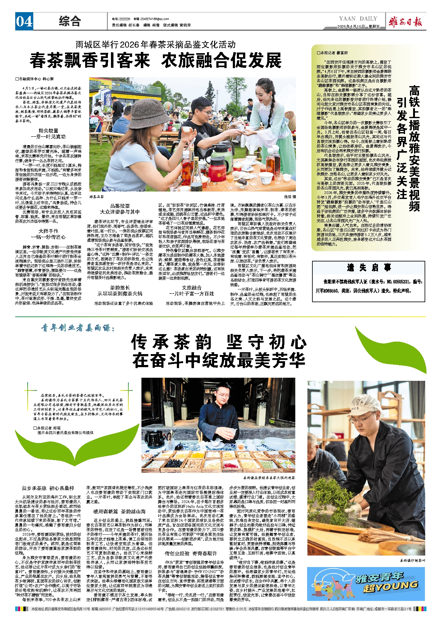 姜雨谦作为姜氏古茶第十五代传承人、四川姜氏茶业有限公司总经理、雅安市青联委员,他毅然放弃北京的工作回到家乡,以青年创业者的锐气与守艺人的初心,让百年古茶在新时代焕发新生,在乡村振兴、文化传承的赛道上书写着青年担当。