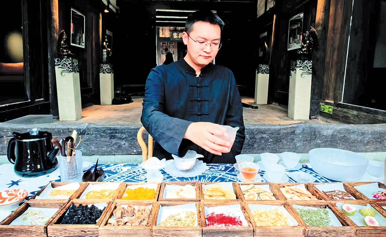 姜雨谦在荥经县姜家大院内泡茶