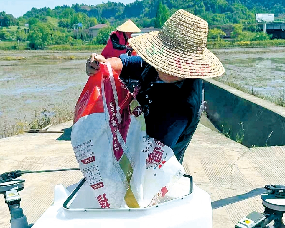 操作人员把肥料倒入无人机料箱市融媒体中心 张天幸 摄