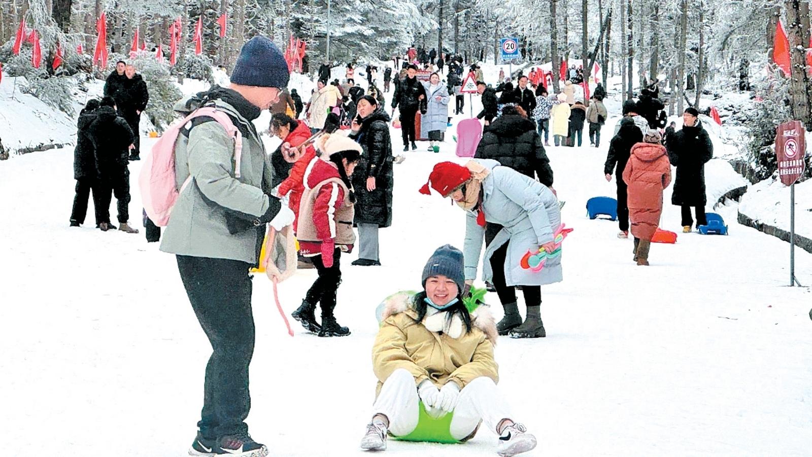 漫步林海雪原,仿佛置身人间仙境。在冰雪世界中体验一场酣畅淋漓的打雪仗、堆雪人、坐雪板,享受冰雪狂欢,回归童真童趣,留下属于假期的美好印记。图为游客在神木垒景区玩雪。