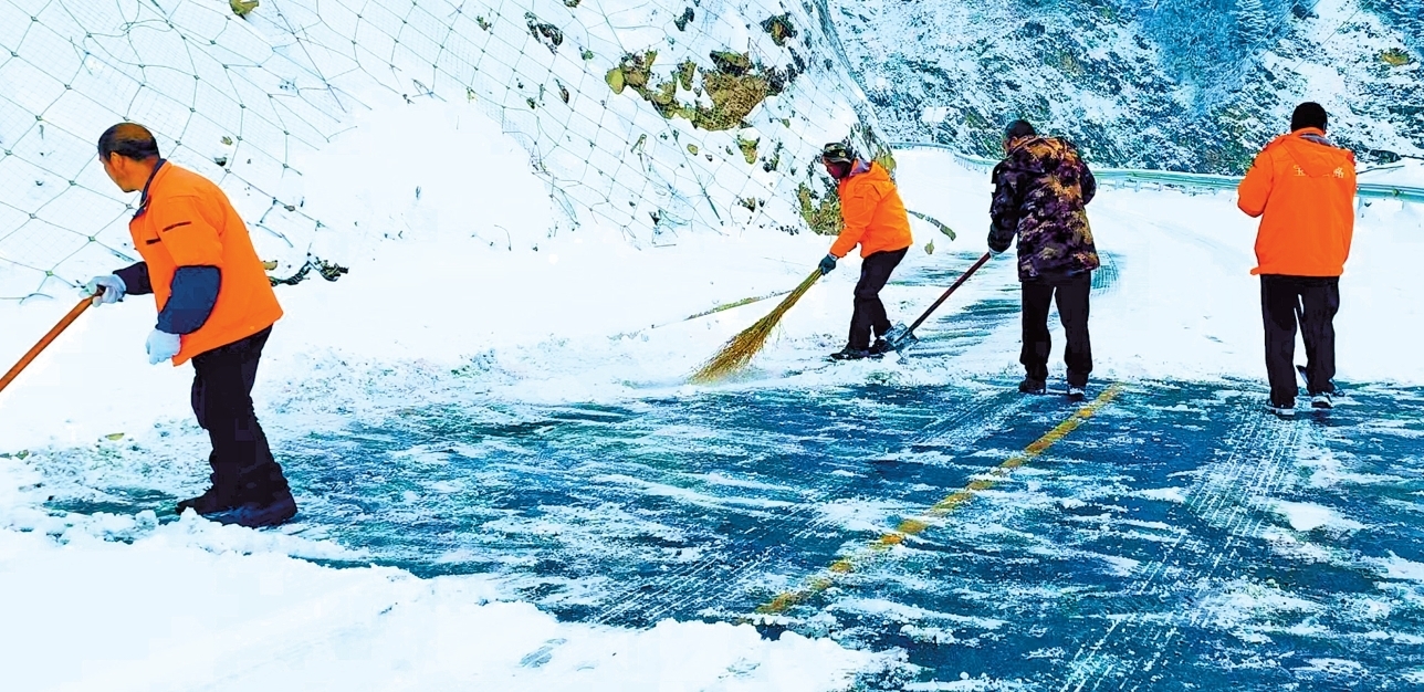 他们身穿橘色马甲,不畏严寒,大把大把地撒盐除冰。他们手持铁锹、扫帚等工具,分工协作、干劲十足。他们背上的“公路养护”四个字格外醒目耀眼。